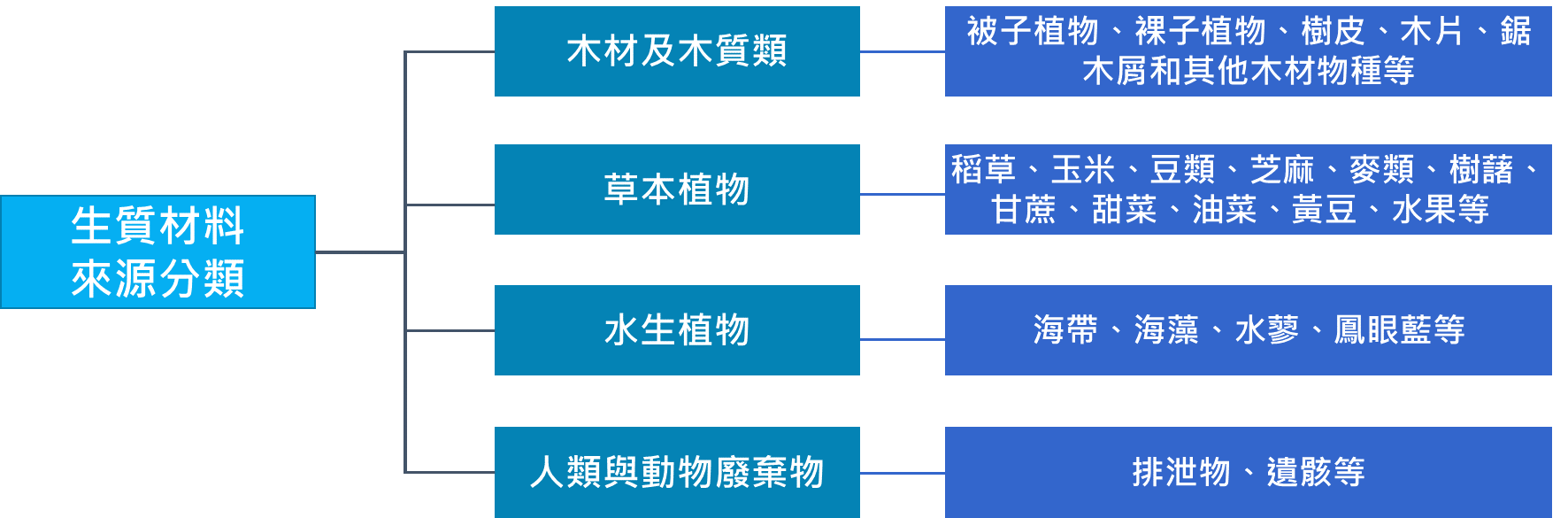 生物質(Biomass)泛指直接或間接由光合作用所生成之有機物質。由於生物質材料的異質性與具不同組成特徵,故沒有明確的生物質分類方法,但可依自然界中存在類型分類,如圖1所示分為四大類。而若以生質材料製造之產品應用分類,則可分為Biopower、Biofuels、Biogas、Biomaterials等,如圖2所示。生質電能 (Biopower),包括直接燃燒生物質來產生氫氣、一氧化碳與甲烷混合物,再配合其他技術與設備(如氣體渦輪或燃料電池等)產生電能;生質燃料 (Biofuels)、生質天然氣(Biogas),將生物質轉變為清潔燃料,主要應用於交通運輸用燃油之取代物;而Biomaterials主要應用則為生質化學品與生質塑膠,由於具有可自然分解特性,可大幅降低對環境的損害。