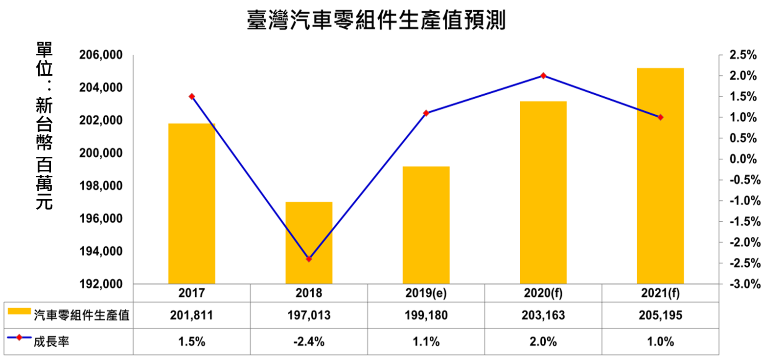圖1:臺灣汽車零組件生產值統計與預估 。資料來源:經濟部統計處(2019);工研院產科國際所(2019/10)