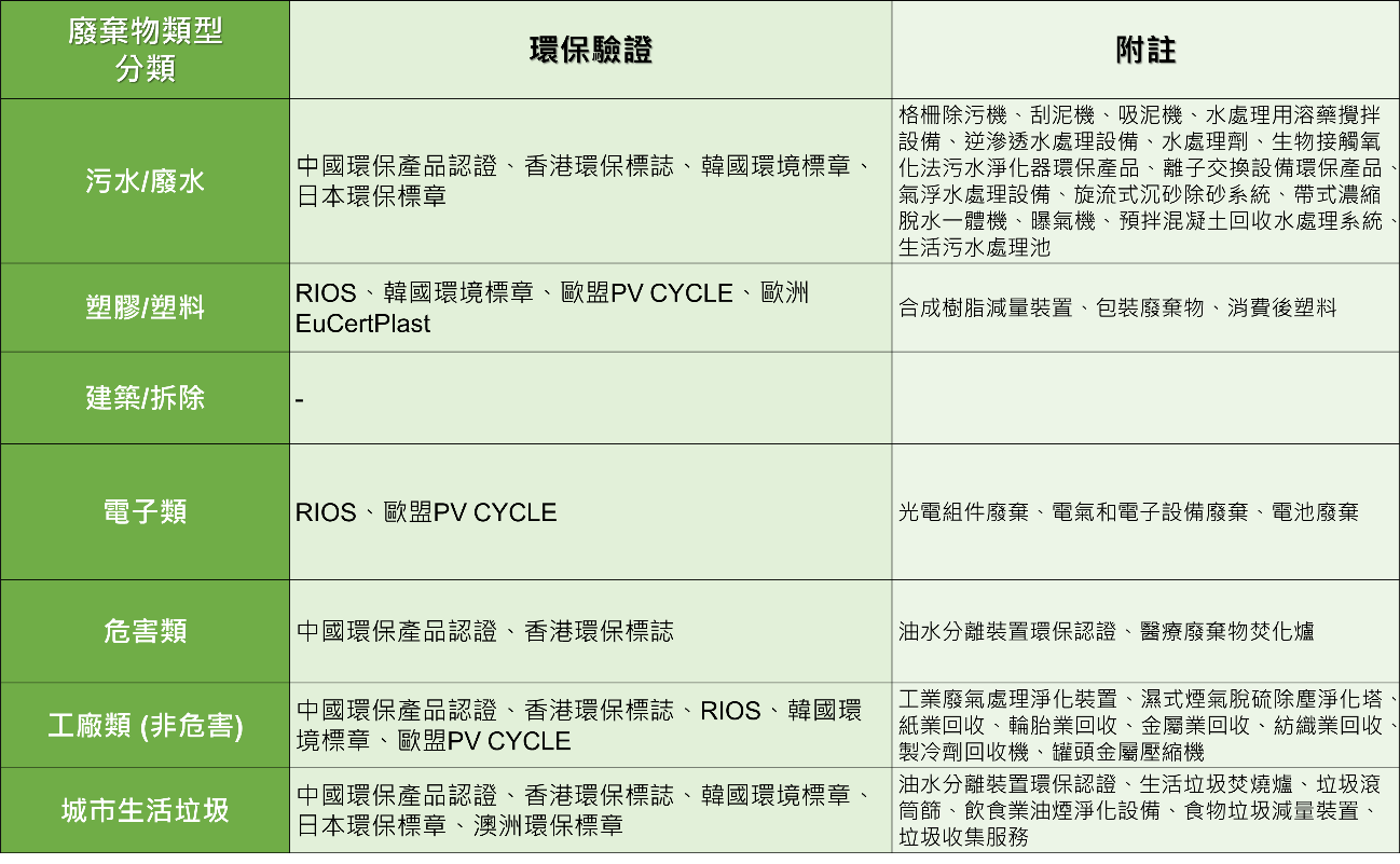 依上述全球廢棄物所區分之五大類外,再新增污水/廢水類,以利研析歸納國際相關環保驗證規範,綜整如下表: