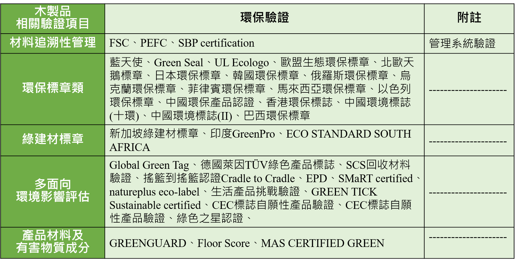 綜合上述內容,木製加工產業之綠色驗證依據其驗證類型可區分為:(1)材料追溯性管理(2)環保標章類(3)綠建材標章(4)多面向環境影響評估(5)產品材料及有害物質成分等5大類,研析綜整如下表: