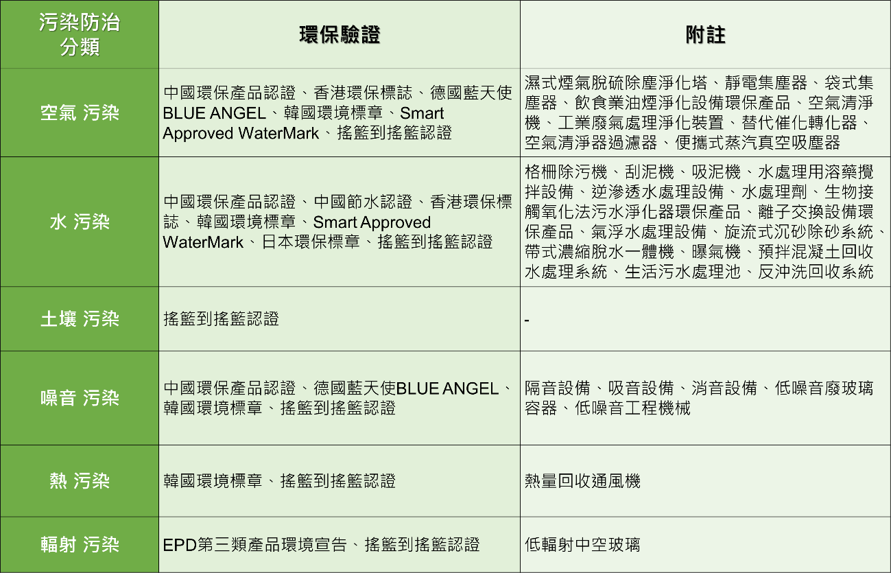 搜集國際關於污染防治之相關驗環保驗證規範,再依上述六類污染類型分類,研析綜整如下表: