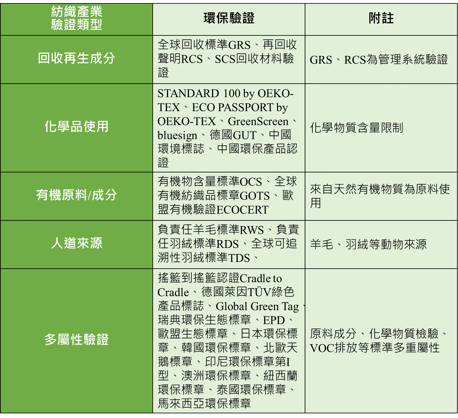 與環保相關之標準除了對環境無負面影響的有害化學物質的殘留及揮發性有機物逸散的規範標準外,由於循環經濟的議題於全球興起,與回收再生相關的驗證及多面向考量的環境多屬性驗證被品牌商所重視;另外還有以有機原料之使用與動物友善之人道來源的綠色驗證及聲明。以下為本平臺搜集國際關於紡織產業相關環保驗證規範,區分為:(1)回收再生成分(2)化學品使用(3)有機原料/成分(4)人道來源(5)多屬性驗證等,研析綜整如下表: