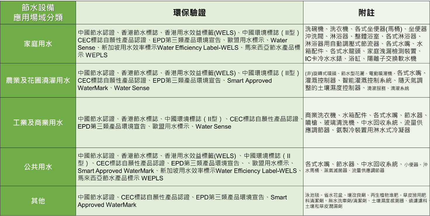研析國際目前節水設備之環保驗證規範後,將節水設備依應用場域區分為:家庭用水、農業及花圃澆灌用水、工業及商業用水、公共用水和其他(有別於傳統水資源利用之產品)等五大類,綜整如下表: