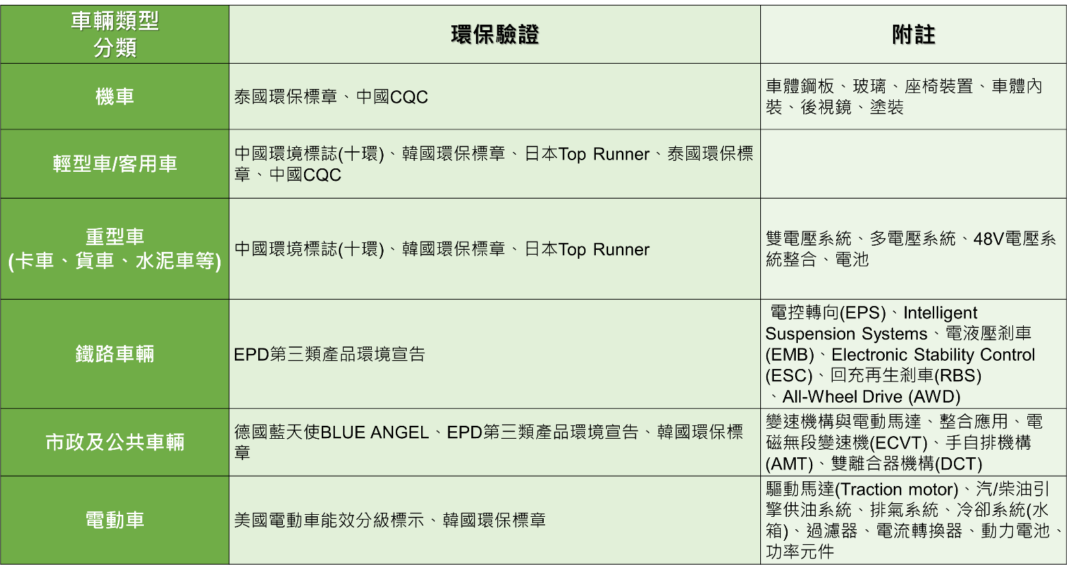 經研析國際目前關於車輛以及汽車零組件之環保驗證規範後,分別依車輛類別(機車、輕型車/客用車、重型車、鐵路車輛、市政及公共車輛、電動車)與汽車零組件(車身、剎車系統、電氣系統、底盤與轉向系統、懸吊與傳動系統、引擎與其零件、儀表、其他等)各自分類,綜整歸納如下表1和表2: