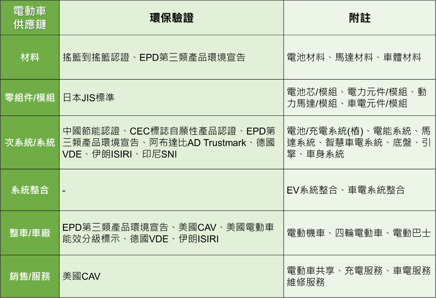 電動車供應鏈可分為材料、零組件/模組、次系統/系統、系統整合、整車/車廠與銷售/服務,經研析國際目前相關電動車驗證規範後,依產業供應鏈分類綜整歸納如下表: