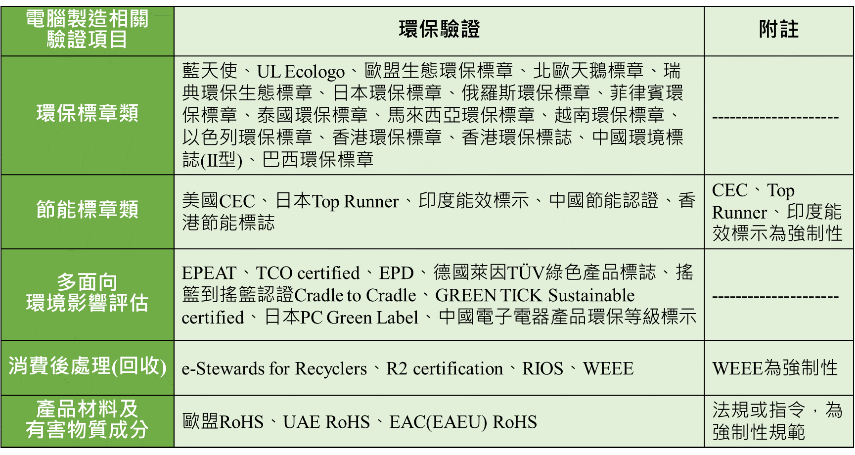 隨著網路的快速發展,電腦製造產品IT設備及其周邊設備廣泛被應用,與時俱進,不斷汰舊換新,推陳出新的時間快速。在IT設備製造的過程當中,可能含有有害重金屬成分,在出口時必須注意符合限用有害物質成分規範,如歐盟RoHS或其他國家的相關指令。各國環保標章及節能標章普遍也針對IT產品訂定綠色規範,鼓勵企業生產對環境友善與節能的產品。另亦有專門設計專屬於電腦製造產品的綠色驗證,除了對於有害物質限制的檢測外,更針對產品之產品性能、生命週期管理、能源管理、材料回收、社會責任…等全面性環境影響進行評估考量的驗證,如EPEAT、TCO等;對於使用後的回收處理,亦有針對電腦製造產業專門之電子回收商進行的綠色驗證,如e-Stewwards for Recycles、R2 certification、RIOS等。