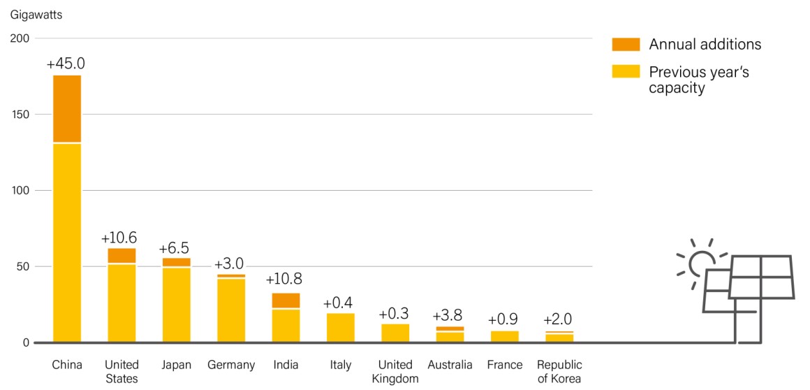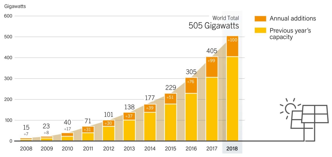 2021年太陽光電全球累積安裝量 (自2004年計算)已達 940 GW,且2018年新安裝量更創歷史新高達100 GW (註1),