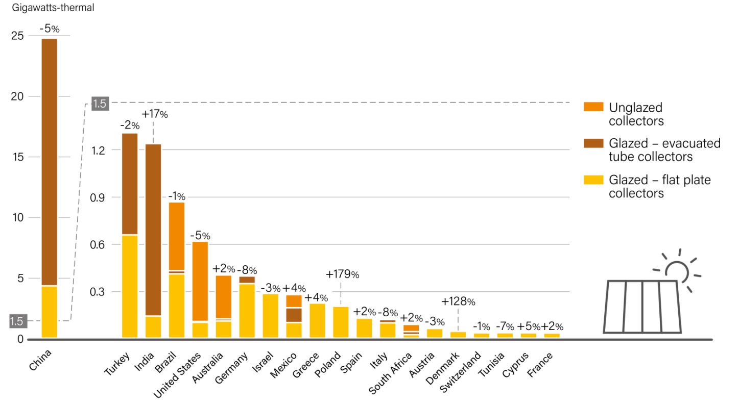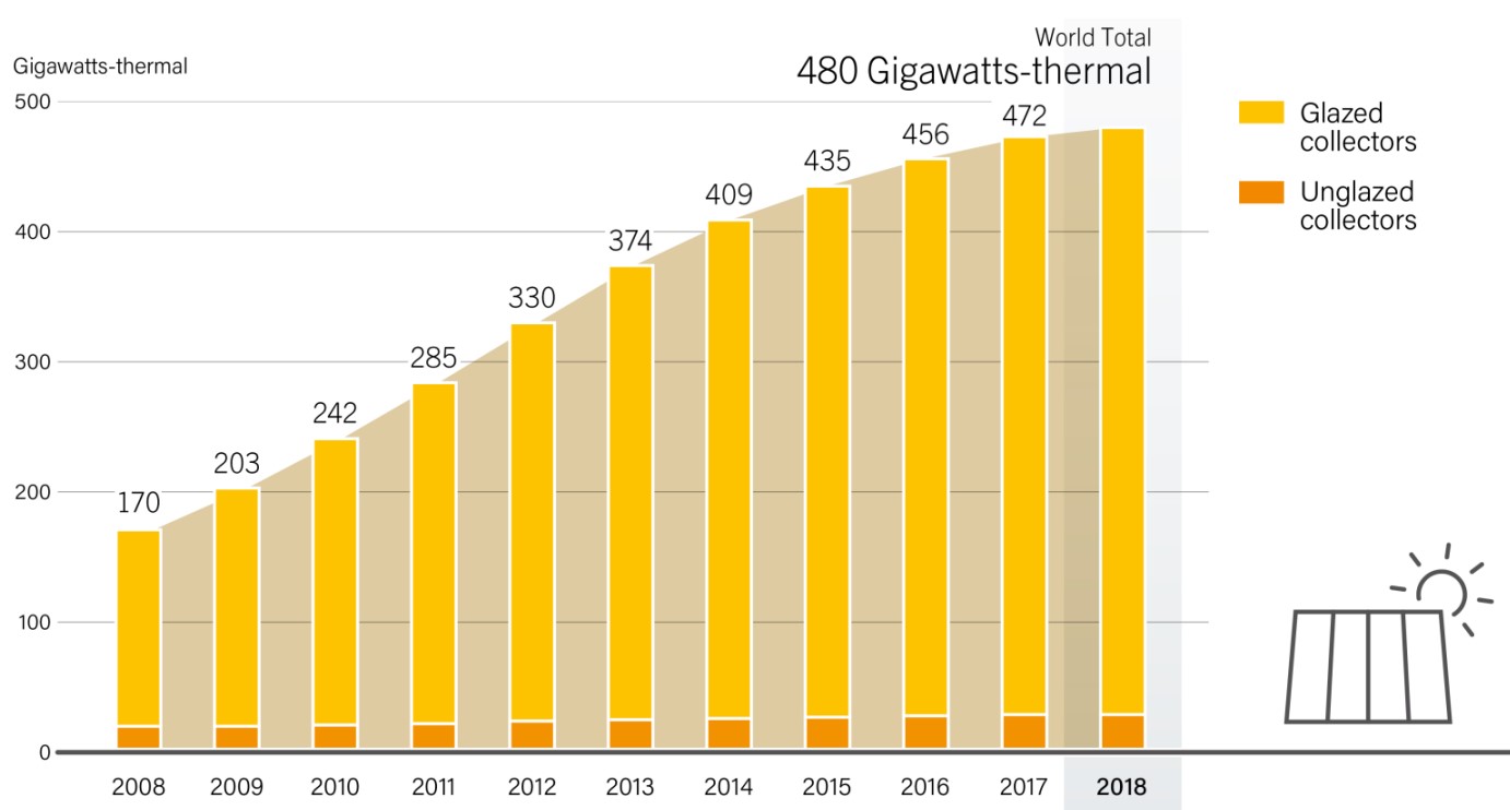 太陽熱能主要商業應用為熱水器系統,依收集器種類可分類為Glazed collector和Unglazed collector兩種。2018年太陽熱能熱水器全球累積加熱量 (自2008年計算)約達 480 GWth (註1),其中大部分為Glazed collector (占比約96%),但年成長率卻是逐年下滑,2018年度成長率僅2%,且年度成長量僅8GWth 為過去十年新低紀錄。但2018年年度太陽熱能市場銷售持續增加,達33.3 GWth ,但仍較2017年年度新安裝量下滑約4%,而2018年全球前五大新安裝量國家依序分別為:中國(24.8 GWth)、土耳其(1.3 GWth)、印度(1.22 GWth)、巴西(0.88 GWth)、美國(0.62 GWth),仍以中國為主要成長動能(74%);但若分析年度成長率,則以波蘭(+179%)、丹麥(+128%)、印度(+17%) (註2)。