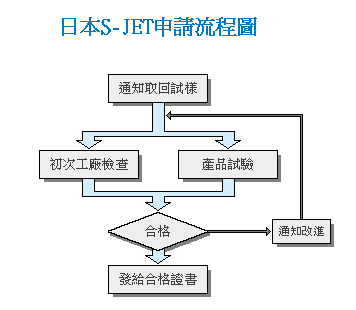 S-JET是日本為了加強業者自主安全驗證而產生的民間專門的第三者機關認證制度,日本電氣安全環境研究所JET(Japan Electrical Safety & Environment Technology Laboratories) 成立於1963年,是日本政府指定的實施型式認可實驗的機構,日本通商產業省 (METI) 指定其進行電氣產品製造廠生產上市前的工廠審查和產品測試頒發的證書,採自願性認證,需要做訪廠檢查。