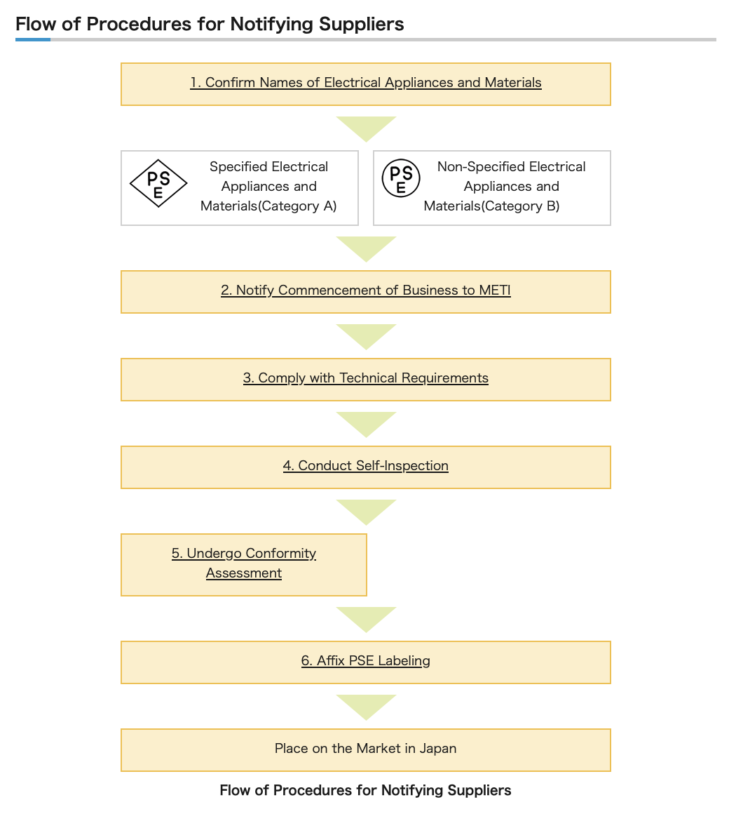 凡屬於“特定電氣用品”目錄內的產品,進入日本市場,必須通過日本經濟產業省授權的第三方驗證機構驗證,取得驗證合格證書,並在標籤上有菱形的PSE標誌。在『非特定電氣用品』部分;屬於圓形PSE的範圍內,廠商可自行提供測試與檢查報告,進行自我宣告後,始能進入日本市場合法銷售。