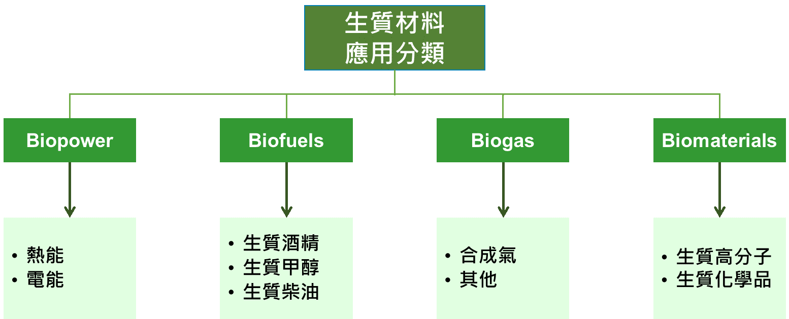 生物質(Biomass)泛指直接或間接由光合作用所生成之有機物質。由於生物質材料的異質性與具不同組成特徵,故沒有明確的生物質分類方法,但可依自然界中存在類型分類,如圖1所示分為四大類。而若以生質材料製造之產品應用分類,則可分為Biopower、Biofuels、Biogas、Biomaterials等,如圖2所示。生質電能 (Biopower),包括直接燃燒生物質來產生氫氣、一氧化碳與甲烷混合物,再配合其他技術與設備(如氣體渦輪或燃料電池等)產生電能;生質燃料 (Biofuels)、生質天然氣(Biogas),將生物質轉變為清潔燃料,主要應用於交通運輸用燃油之取代物;而Biomaterials主要應用則為生質化學品與生質塑膠,由於具有可自然分解特性,可大幅降低對環境的損害。