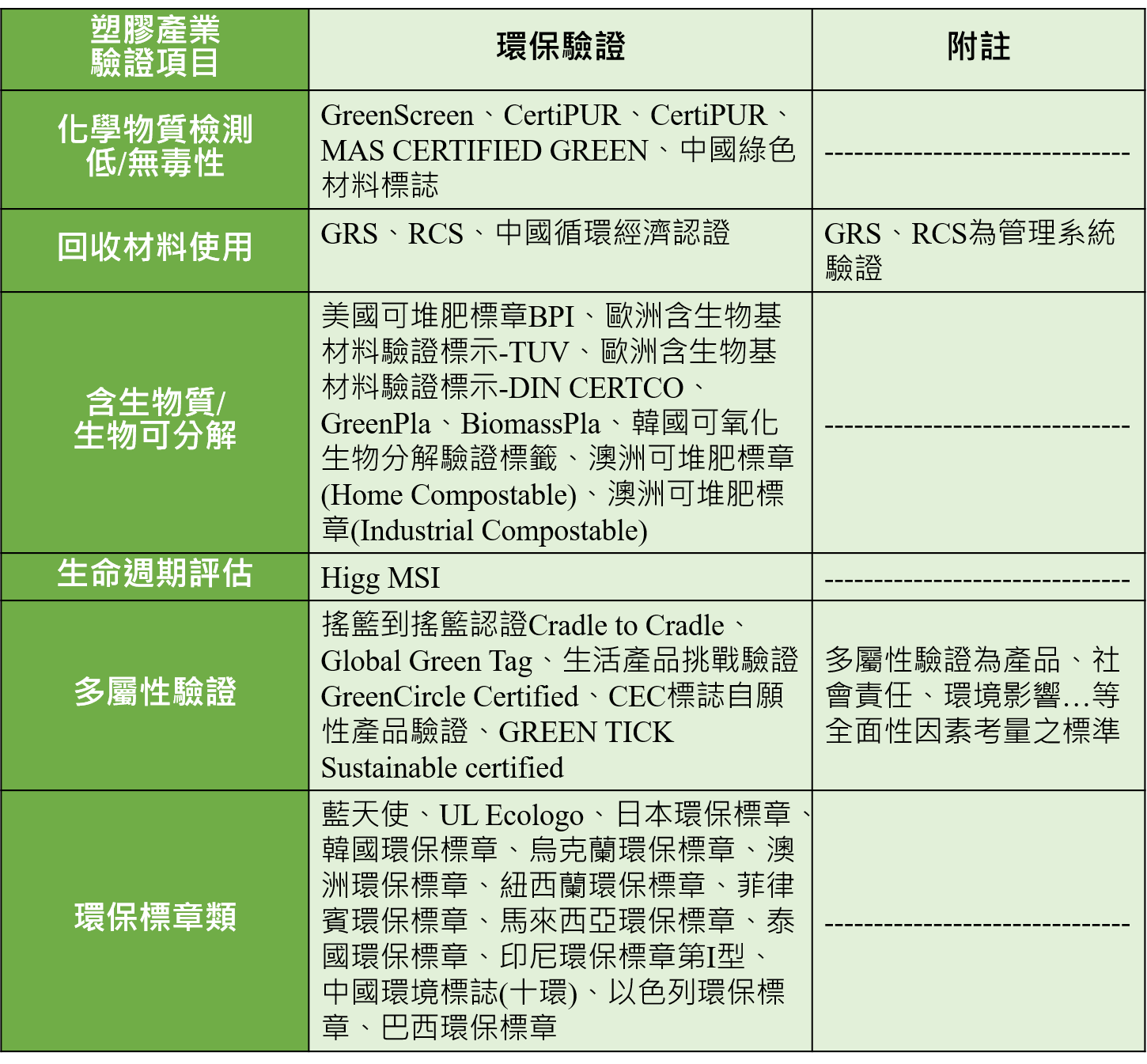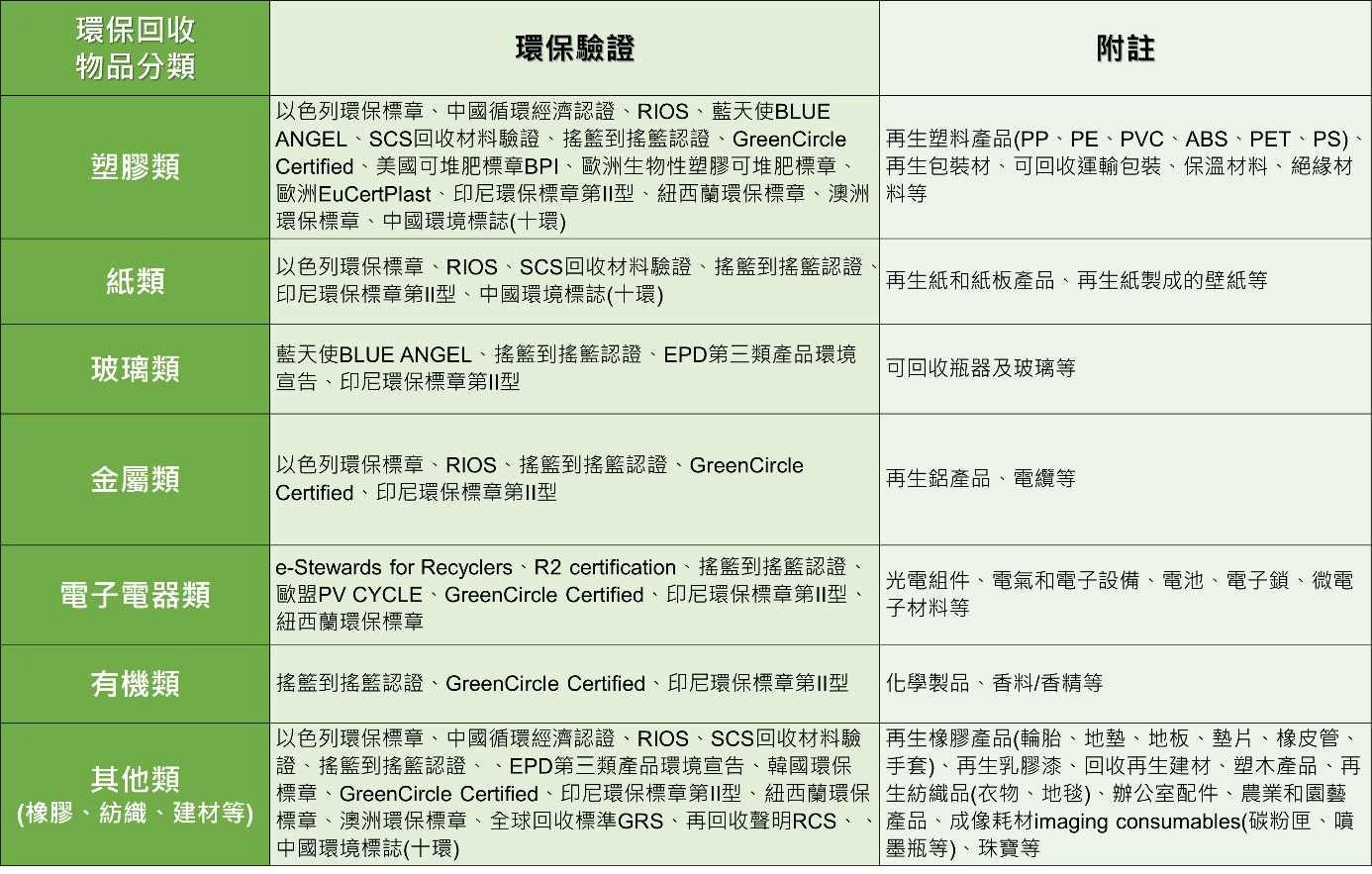 將環保回收依不同物品分類,分為:塑膠類、紙類、玻璃類、金屬類、電子電器類、有機類和其他(橡膠、紡織、建材等),經研析歸納國際相關環保驗證規範後,綜整如下表: