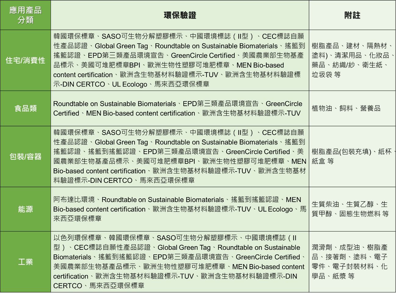 根據Research Nester分析及預估,2027年全球生質材料市場規模將從2018年之170億美金成長為約800億美金,其主要成長驅動力為全球對可持續和清潔能源的需求之持續增長,同時主要產碳國家(如中國,印度,美國,德國和英國等)持續加強法規,亦支撐著全球生質材料市場之發展。經研析國際目前相關驗證規範後,依應用產品分類綜整歸納如下表: