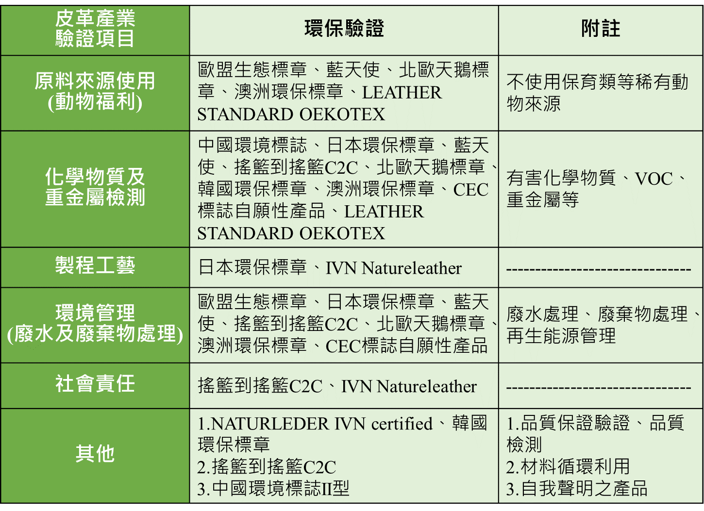 皮革原料來源主要為食品業和屠宰場的肉類廢棄物加工而來,並將原料以加工及製革轉化製成成品。皮革產品在製造加工過程中,會大量使用化學品,因此會造成有害物質殘留、資源消耗以及製程廢水與固體廢棄物等環境污染相關衍生問題。因綠色意識提高,各國針對環境議題提出新的法規依據,不僅環境面(廢水、廢棄物處理、產品有害物質逸散等問題)要求,社會責任及道德意識(動物福利)也歸於綠色議題之中,以在全方位的設計考量下,讓產業得以永續經營。以下為本平臺搜集國際關於皮革產業相關環保驗證規範,包括:(1)原料來源(動物福利)(2)化學物質檢測(3)製程工序(3)環境管理(廢水及廢棄物處理)(5)社會責任(6)其他,研析綜整如下表: