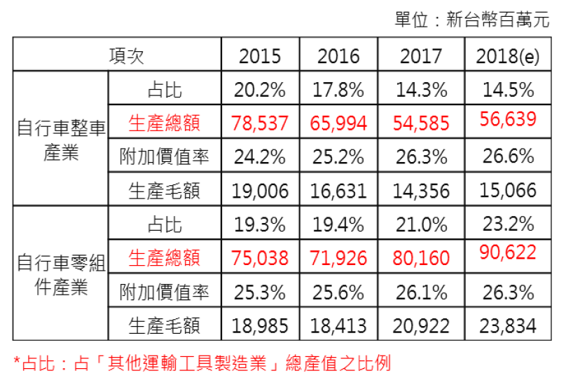 表1:臺灣歷年自行車整車與零組件產值,