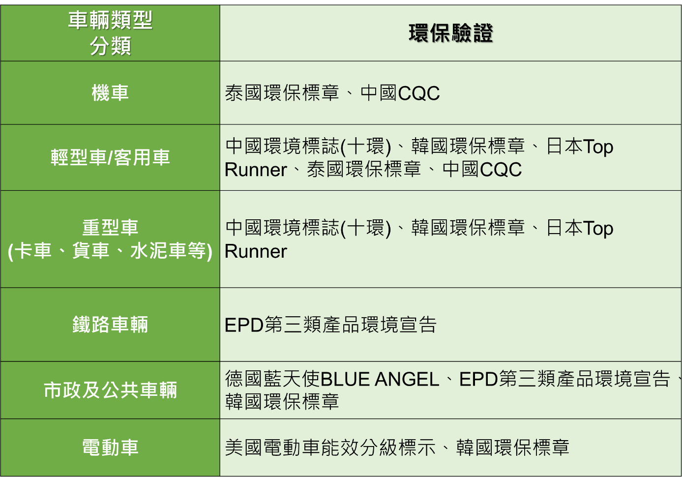 經研析國際目前關於車輛以及汽車零組件之環保驗證規範後,分別依車輛類別(機車、輕型車/客用車、重型車、鐵路車輛、市政及公共車輛、電動車)與汽車零組件(車身、剎車系統、電氣系統、底盤與轉向系統、懸吊與傳動系統、引擎與其零件、儀表、其他等)各自分類,綜整歸納如下表1和表2: