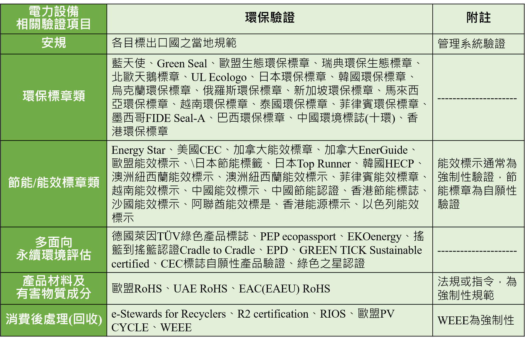 針對電力設備產業之綠色驗證依據其驗證類型可區分為:(1)安規類型驗證(2)環保標章類(3)節能/能效標章(4)多面向永續環境評估(5)產品材料及有害物質成分(6) 消費後處理(回收)等6大類,研析綜整如下表: