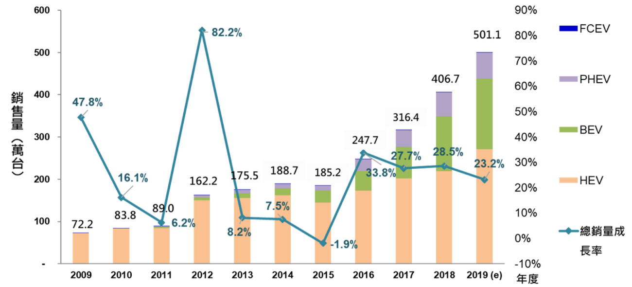 圖1:2009年~2019年全球電動車銷售統計與預估 資料來源:Marklines(2019/9);工研院產科國際所(2019/9)