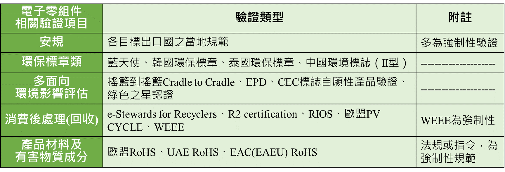 而針對電子零組件產業之綠色驗證依據其驗證類型可區分為:(1)環保標章類(2)節能標章類(3)多面向環境影響評估(4)消費後處理(回收)(5)產品材料及有害物質成分等5大類,研析綜整如下表: