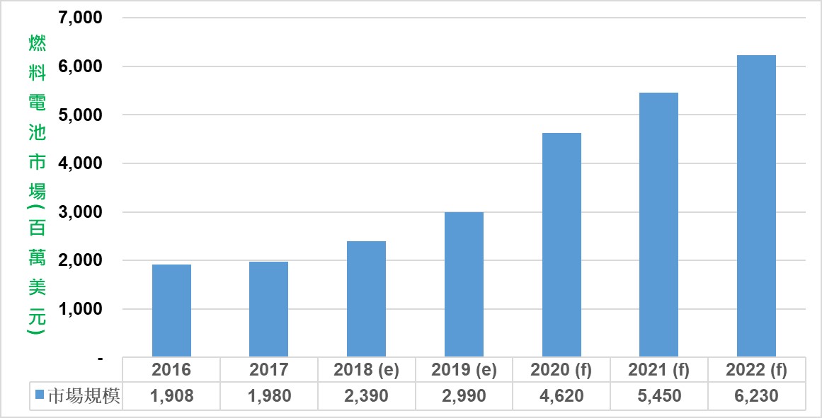 圖2:2016 ~2022年燃料電池全球市場發展趨勢 (資料來源:富士經濟(2018/12);工研院綠能所)