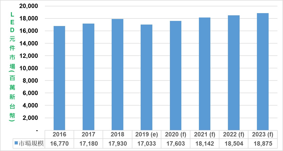 圖2:2016~2018年、2019~2023年 全球 LED 元件市場規模與預測 ,資料來源:工研院綠能所 (2019/09)