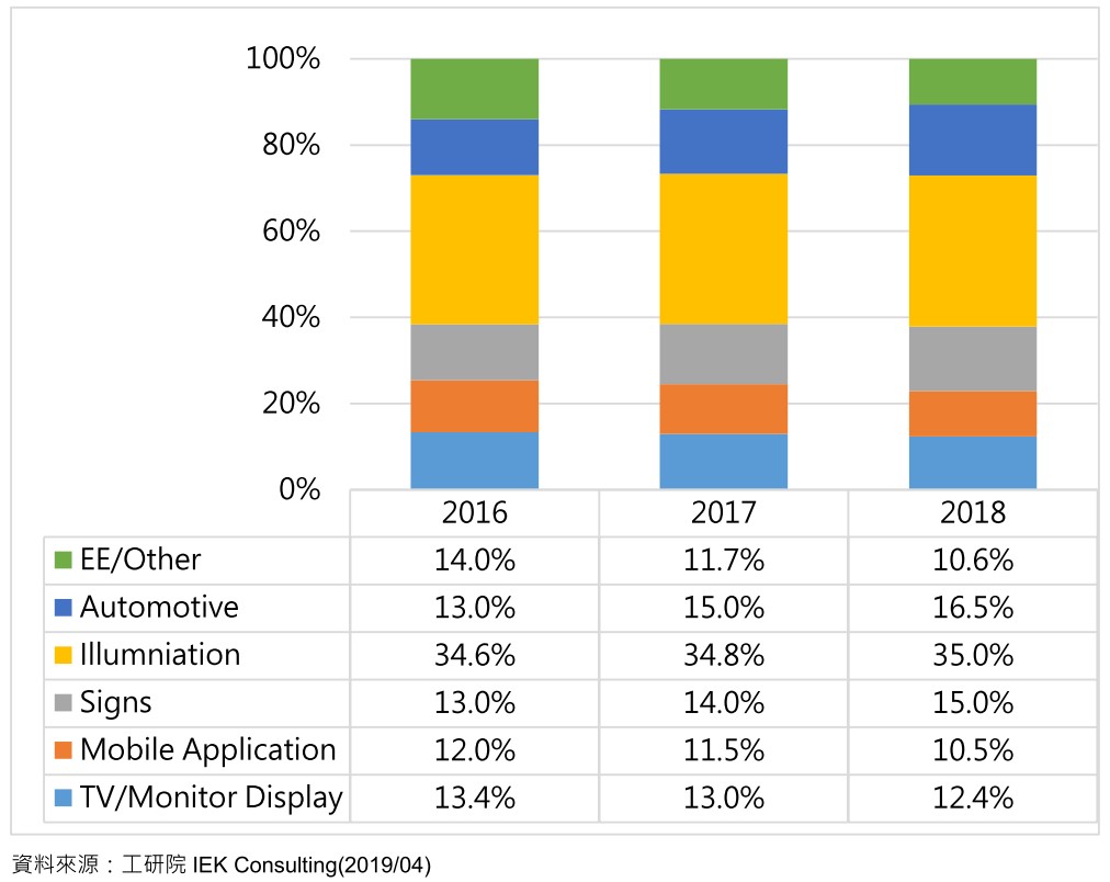 圖1:2016~2018 全球 LED 元件應用市場分析 ,資料來源:工研院 IEK Consulting (2019/04)