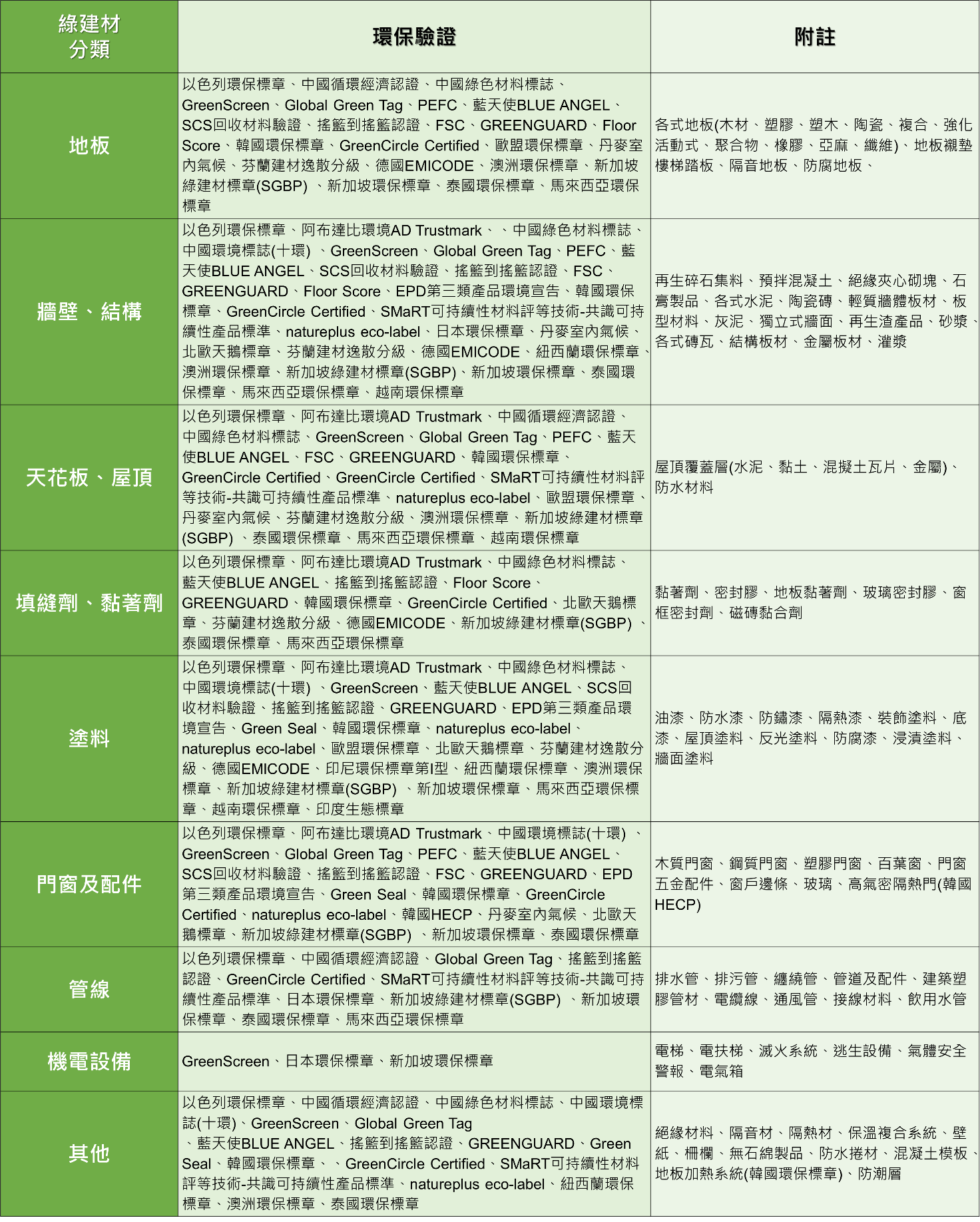 搜集國際關於綠建材之相驗環保驗證規範,區分為:(1) 地板、(2) 牆壁/結構、(3) 天花板/屋頂、(4) 填縫劑/黏著劑、(5) 塗料、(6) 門窗及配件、(7)管線、(8)機電設備、(9)其他(絕緣材料、壁紙、地板加熱系統等)等,研析綜整如下表: