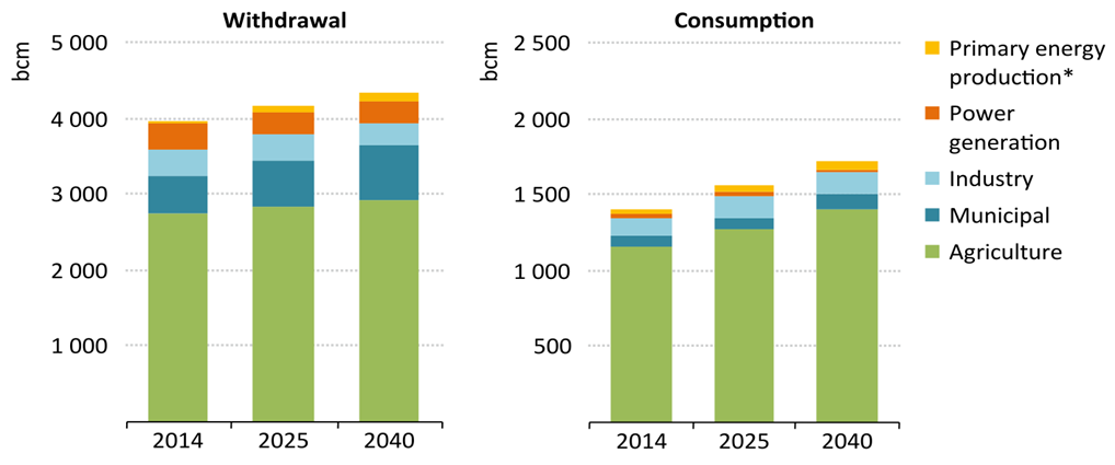 根據World Energy Outlook及聯合國糧食及農業組織(FAO)預估,在未來數十年,全球對於水需求量之成長率將是人口成長率的兩倍。而隨著經濟型態轉變與基礎設施建置,全球用水量逐年遞增,且受到日益增長的城市化和不斷提高的生活水平的影響,均將使水需求量增加。預估2040年全球水需求量將比2014年提升10%,但是消耗量卻增加20%,其中約有60%增加量來自於印度、非洲及亞洲發展中國家(中國除外)。其中農業用水量仍是佔最大比例,而市政(Municipal)用水量預估將從2014年佔比13%提升為17%。(如圖1所示)