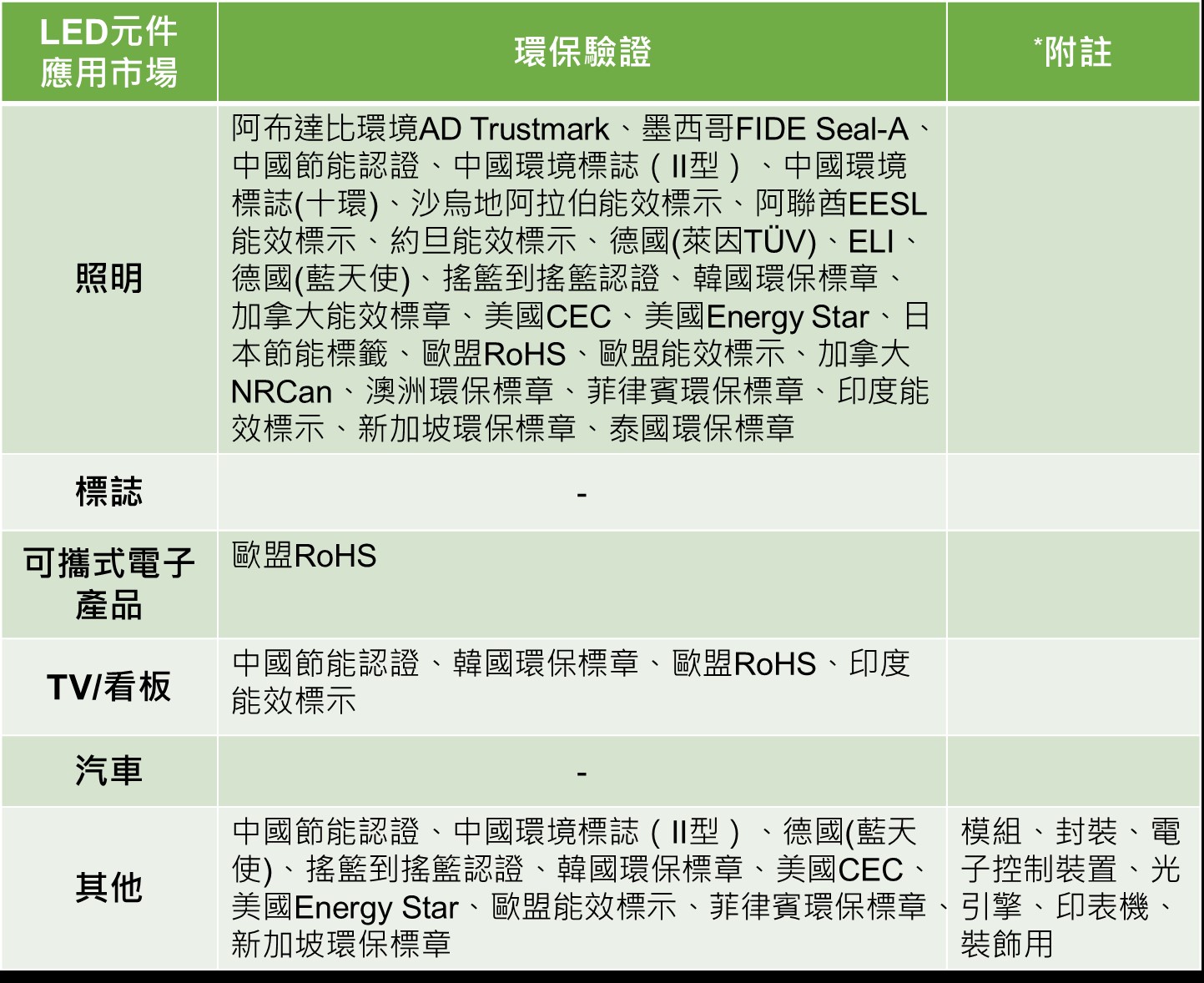 表1:LED元件應用市場環保驗證: