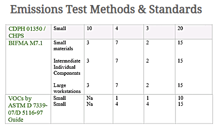 針對建築物、學校和住宅內揮發性有機化合物(VOC)排放對健康造成的影響,監管機構和行業團體制定了減少建築產品和家具中有害化學物質釋放的標準。商業和公共機構家具製造商協會(BIFMA)和其他組織已經建立了這些關注點,以開發其他測試協議和標準。